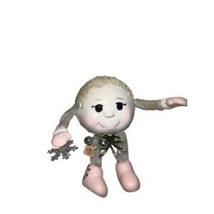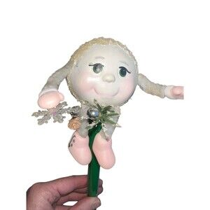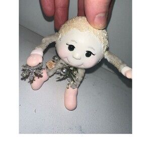 Charming vintage-style snow baby shelf sitter with moveable pipe cleaner arms and legs. Features a glittered snow-textured head, soft pastel accents, and a friendly face perfect for retro Christmas displays.