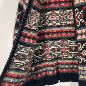 Stay warm and stylish with this women's patterned sweater. Featuring a classic design in black, red, and white, it's perfect for any occasion. Full zip front, fold over collar.