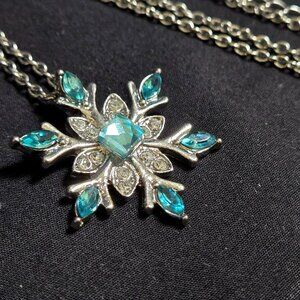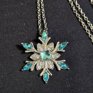 Vintage Snowflake Pendant Necklace 22" Chain Silvertone Blue & Clear Rhinestones