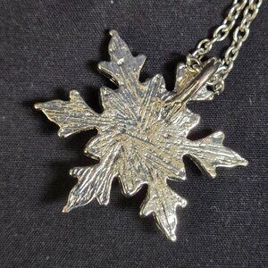 This vintage snowflake pendant necklace is a timeless piece featuring a stunning silvertone finish. Adorned with eye-catching blue and clear rhinestones, it offers a touch of elegance. The 22-inch chain makes it versatile for various looks. Its intricate design captures the essence of winter charm, blending classic style with a hint of sparkle.