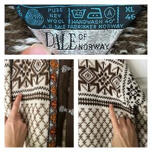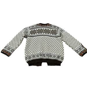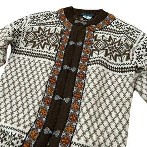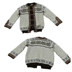 Authentic Dale of Norway 100% pure new wool cardigan featuring traditional Nordic star and geometric patterns in warm shades of brown, cream, and orange. Classic buttonless front with pewter hook clasps and beautifully detailed woven trim along the placket, cuffs, and neckline. A timeless piece of Norwegian craftsmanship — warm, collectible, and built to last.