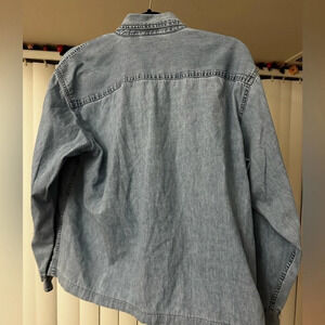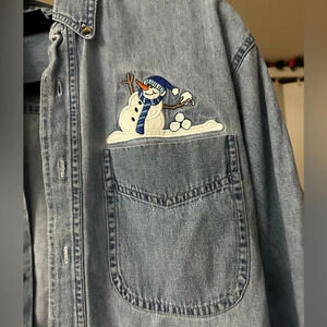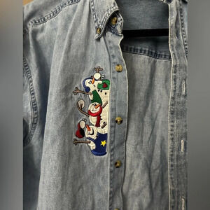 Vintage Snowman Embroidered Denim Button Down Womens Sz Small Winter Christmas