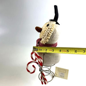 - Fabric Snowman with a stylish black top hat, sporting a cozy burgundy scarf for the touch of warmth and clutching a few candy canes on a bouncy spring.