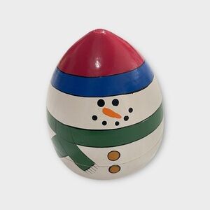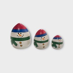 Charming set of 3 wooden snowman nesting dolls, perfect for adding a festive touch to your holiday decor. Each snowman is hand-painted with a red hat, green scarf, and adorable snowman face details. A fun and nostalgic piece for Christmas decorating, winter centerpieces, or as a unique collectible gift.