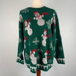 Super fun vintage sweater featuring a snowman and snowflake design. It measures 23 inches armpit to armpit length flat and is 27 inches in length from the shoulder to the hem.