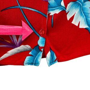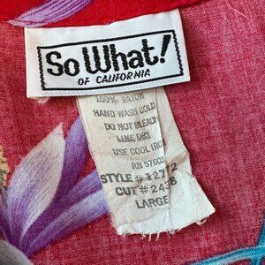 Vintage So What! Of California Floral Red Button Hawaiian Shirt Girls Size Large - Lightweight short sleeve collared button down shirt top - shade of red with a blue, purple & white tropical floral & palm leaf pattern. 100% Rayon. Made in the USA. Vintage, retro, vacation, travel, beach