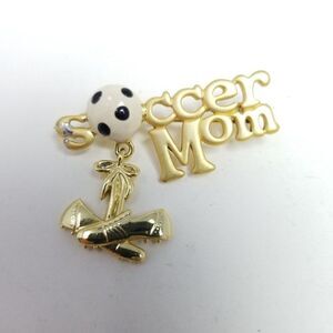 Vintage Soccer Mom Brooch, Gold Tone Enamel Ball and Cleats Lapel Pin, Sports