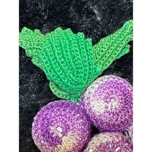 This crocheted wall hanging is designed to resemble a grape cluster, featuring detailed purple and cream hues with a green leaf accent.
