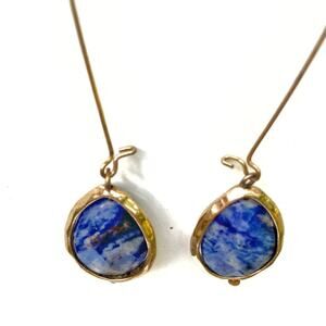 vintage sodalite earrings, teardrop gemstone earrings, gold plated drop earrings, rotating stone earrings, long dangle earrings, nickel free vintage jewelry, 90s french girl style, artisan blue stone earrings, vintage gold cage earrings, statement earrings minimal, poshmark jewelry finds, unique gift for her, editorial earrings, rare vintage dangles, dreamy blue stone earrings