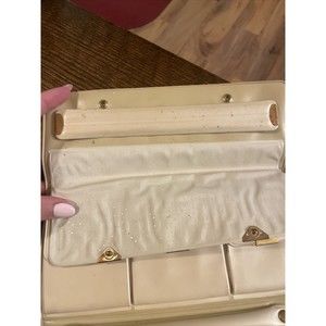 This piece is lots of fun and very useful when traveling. Soft sided roll up jewel case with a snap front. Inside there is a spot for rings, three snap compartments for earrings necklaces, bracelets, etc. all snaps are in place only minor signs of wear. When rolled up measures approximately 8.5 inches by 4 inches. Unrolled measures approximately 12 x 8.5 see pictures for details No major issues, and in nice vintage shape