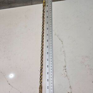 This vintage gold-tone metal chain belt adds a touch of sophistication to any ensemble. Its intricate, ornate link design exudes elegance and style, making it a versatile accessory for both formal and casual occasions. With a secure clasp and adjustable length, it ensures a comfortable and personalized fit.