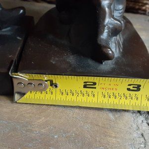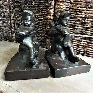 These where mine when I was a kid back in the late 50s Over the years I had them stored. Sadly one of the bookends is damaged but still works as for these are solid brass and heavy. Whats missing you probably would not notice but it has the front child's leg and rope broke off.