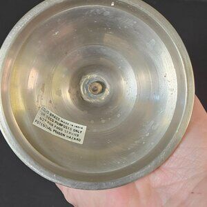 CONDITION: Minor scratches, patina, and slight discoloration visible on the base and body. I saw one small dent as seen in photos. There is a bit of wax residue in the candle spot. Please see all photos for details.