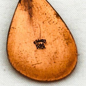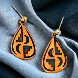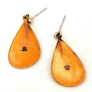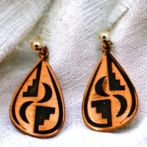WM Wheeler Co Stamped Southwestern copper teardrop shaped earrings by the WM Wheeler Company. Etched and oxidized copper dangle earrings. The teardrop bottom dangles from a ball post. New clutch type earbacks have been added. Not heavy. Length is approximately 1-3/8" total and 5/8" wide. Signed WM Co. (1980s)