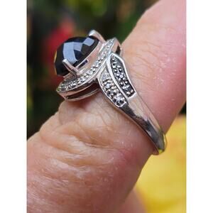 Featuring a teardrop shape, emerald cut, prong set, black onyx with small pave set cubic zirconia on either side..see photos for better description.