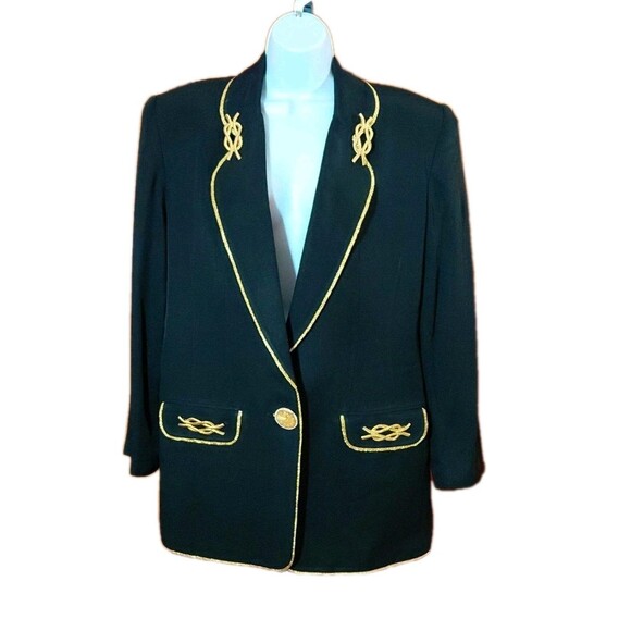 This vintage Solini Women's Jacket Blazer in size 14 is a classic and stylish piece perfect for formal occasions like weddings, parties, or cocktails. The black jacket features gold zippers and a lined interior, providing both style and comfort. With a long jacket length, long sleeves, and a one-button front, this blazer showcases a timeless design with a touch of elegance. The jacket is made of acetate material and has a polyester lining, making it suitable for all seasons. Perfect for those looking for a designer piece that exudes a sense of special occasion sophistication.