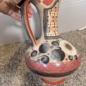 This vintage Solis Tonala Mexico hand painted pitcher featuring intricate designs of water doves and flowers is a beautiful piece of Mexican culture. Handmade in Mexico by a skilled artist, this pottery item showcases traditional Mexican craftsmanship and artistic flair. The pitcher is adorned with vibrant colors and unique details, making it a perfect addition to any collection of Latin American art and pottery.