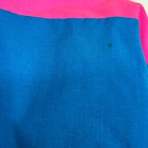 Black polyester blend polar fleece with neon pink and blue colorblock across shoulders