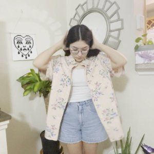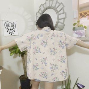 Light pink floral print oversized top has broderie all throughout. 100% cotton
