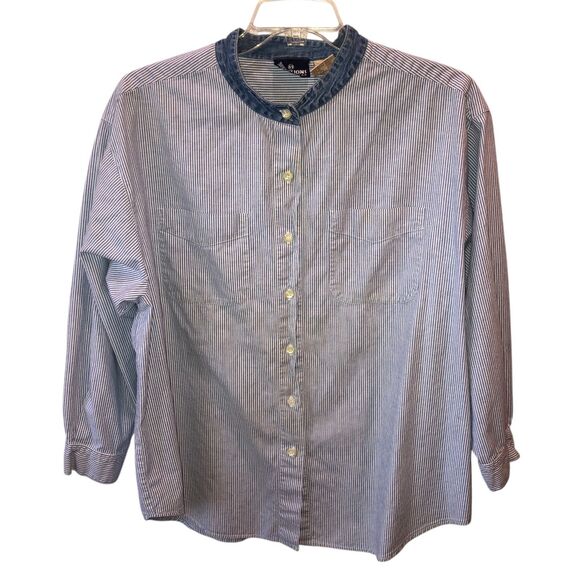 Vintage Solutions Womens 2X Blue White Striped Banded Collar Button Up Shirt