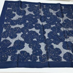 Chic scarf featuring navy fabric with gold accents. Ideal for a stylish touch. Utterly unique and truly a one of a kind vintage piece. May be from the late 1980’s.