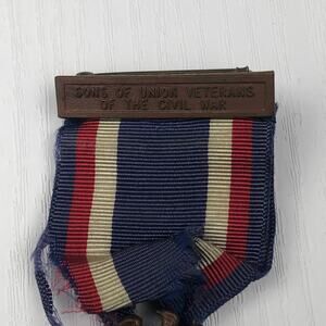 Vintage Sons of Union Veterans of the Civil War membership medal. There is some tearing and fraying to the ribbon material, please see images. The ribbon has some yellowing to the white stripes as well.