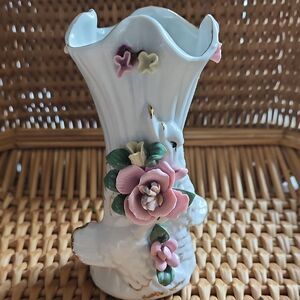 Delicate porcelain flowers adorn this scalloped edged gold tone accented vintage vase.  There are 2 gold tone accented birds intertwined with florals.  Small Florals dot 4 of the scalloped edges, while the main floral bouquet is with the birds.  The vase is ribbed