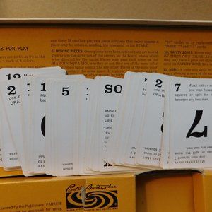Comes with 45 cards and the playing board. Does not state how many cards it originally had. The game board has yellowing/marks from use and age.