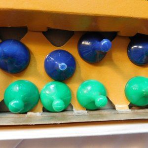 Comes in the original box, all plastic game pieces are in the box, (one of the blue ones is broken on top but still usable)