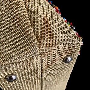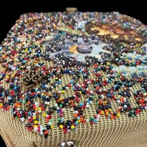 The front has needlepoint, multi-color seed beading, rhinestones and 4 metal flower clusters.