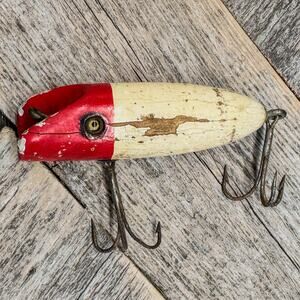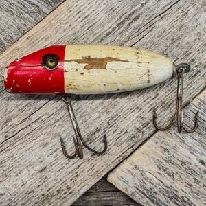 Vintage South Bend Bass Oreno Fishing Lure-Red & White-Wooden-2 Triple Hooks