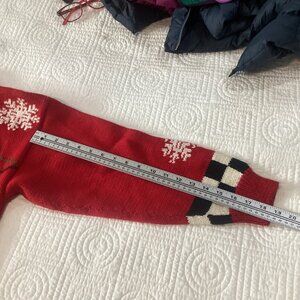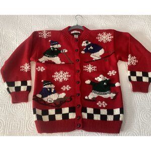 he Vintage South Wool Cardigan Sweater is a women's medium red sweater with a crew neckline and button accents. Made in Uruguay, it features a graphic of polar bears and is perfect for occasions such as travel, parties, casual wear, or workwear. This sweater is a heavyweight knit with a stretchy and breathable fabric, making it ideal for the winter, fall, and spring seasons. The classic 90s style and Christmas holiday theme add a unique touch to this vintage piece, which should be dry cleaned only to maintain its quality.