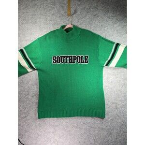 Vintage Southpole varsity sweater. Kelly green mock neck. Applique logo. 100% acrylic. Men's size XL. Good pre-owned condition. Normal wear. There are 2 snags. One is on the back, and the other is on the back of the left sleeve. Please see the last 2 pics. Measurements laying flat:
