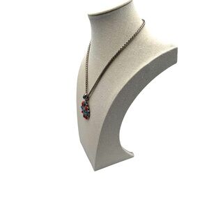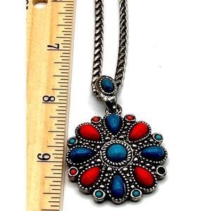 A beautifully crafted antique-inspired necklace featuring vibrant faux turquoise and coral gemstones set in an intricate silver tone pendant. Ideal for adding a touch of vintage charm to your ensemble.