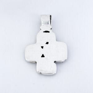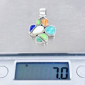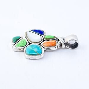 This vibrant vintage cross pendant captures the spirit of the Southwest with a mosaic of colorful natural gemstones set in sterling silver. The blend of turquoise, spiny oyster, lapis, and others creates a bold yet balanced aesthetic. Ideal for casual boho looks or adding earthy charm to a layered necklace stack.