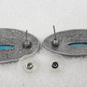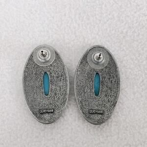 Elevate your accessory collection with these striking Vintage Southwest Style Pierced Earrings, featuring the elegance of faux turquoise cabochons. Crafted in the 1980s, these earrings embody the essence of the era with their pewter composition and oval shape, complemented by the captivating turquoise hue that adds a touch of nature-inspired beauty to any outfit. The earrings are thoughtfully designed with surgical steel posts, ensuring comfort for pierced ears, and they measure 1.75 inches in length, making a statement without overwhelming. Signed by ©JJ, these earrings are a testament to the artistry of the period, perfect for aficionados of retro fashion and costume jewelry.