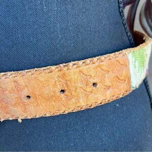 This belt is so amazing! It has the signature of the artist on the inside as seen in photo. It does have some fading, cracking, wear, and some staining, all seen in pics. However I do think it has a lot of life left. And the wear adds to the vintage look. This belt is sold as is. No returns. Accessories in pic not included. Please see all photos they are part of the description. No returns so feel free to ask questions. Thank you!!