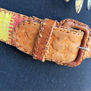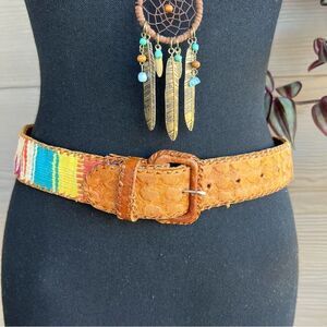 Vintage Southwestern Aztec Mexico Serape Woven Leather Handmade Tooled Belt XS/S