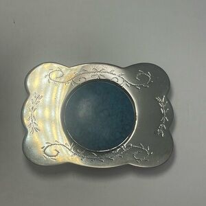 Vintage detailed engraved tin belt with a rich beautiful faux turquoise stone in the middle. This vintage piece will make your southwest look complete. Great condition.