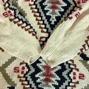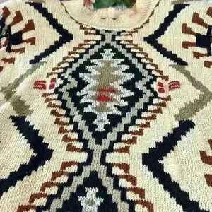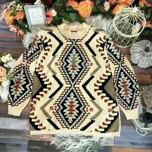 Channel cozy retro vibes with this 80’s vintage Jeanne Pierre Woman mock neck sweater, featuring a striking Southwestern geometric pattern in earthy tones. Made from a soft, substantial cotton-ramie blend and crafted in Hong Kong, this oversized knit is perfect for layering and adds a bold pop to any casual outfit. Tagged a size 2X, it looks adorable worn roomy on smaller frames for that laid-back, slouchy fit.