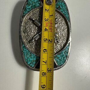 Vintage Southwestern Silver Tone Tomahawk Inlay Blue and Red Stone 3 x 2” buckle