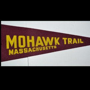 Vintage souvenir pennant of the Mohawk Trail Massachusetts. Maroon color with yellow lettering. Measures 26 inches long, 9 inches wide, and tapers.