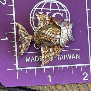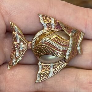 Vintage signed Spain Damascene Faux Pearl cabochon belly fish pin. Lovely heart detail on tail. See photos for size and details