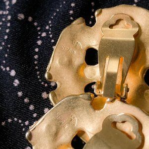 Up for sale is a vintage pair of Spanish made matte gold medallion clip-on earrings. Each earring measures approximately 1.75″ in diameter. This pair has a beautiful gold finish, tight grip, and are in excellent vintage condition!