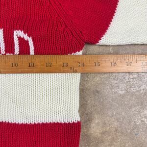 Here’s a true vintage Spark Plug knit sweater that’s full of retro charm. It features bold red and white stripes with “THE KID” stitched across the chest in block letters. The sweater has a chunky fold-over ribbed collar along with ribbed cuffs and hem, giving it that classic old-school look and fit.