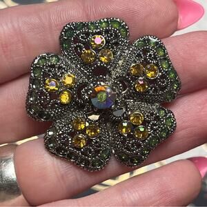 Welcome to the Bohemian Maven and thank you to both my new and long time customers for the ongoing support of my small business! You make it possible for me to continue hunting daily for unique treasures for you.This large floral brooch features vibrant green and yellow aurora borealis rhinestones, perfect for adding a touch of elegance to any outfit. Its intricate design makes it a standout accessory.