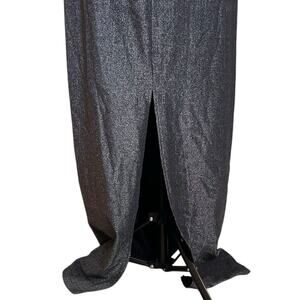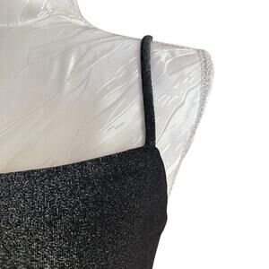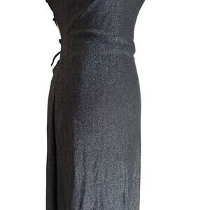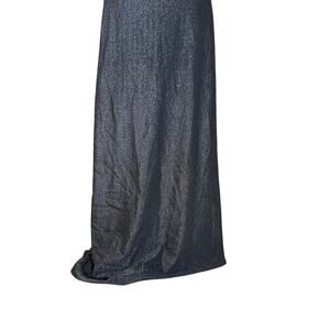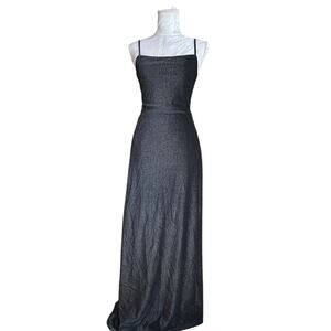 Vintage 1990s sparkling metallic bodycon dress, women’s size XS. Features a dramatic cutout silhouette, lace-up back, spaghetti straps, and elegant square neckline. Full-length formal fit with shimmering stretch fabric—perfect for Y2K parties, club nights, or statement eveningwear.