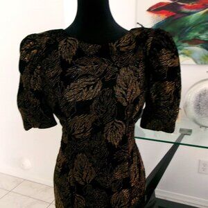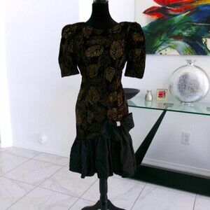 Vintage Sparkly Glittery Ruffle Bottom Short Sleeve Dress S Black Gold 80s