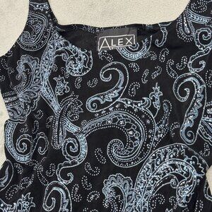 Gorgeous scoop neck tank top in black with a light blue paisley all over print with glitter that sparkles beautifully! Lightweight and stretchy by Alex Evenings.