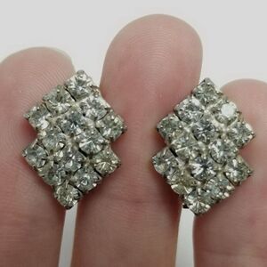 Vintage Sparkly Rhinestone Cluster Clip On Earrings, Retro Silver Tone Estate